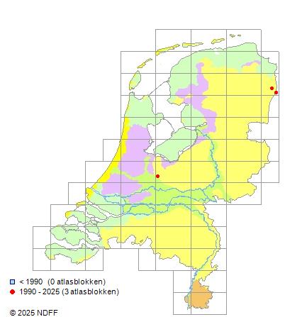 Het aantal atlasblokken (5x5 km) waarin de soort is gemeld binnen een periode van vijf jaar (vanaf 1980) of twintig jaar. Niet gecorrigeerd voor waarnemersinspanning en het aantal doorgegeven waarnemingen kan sterk variëren per periode, dus een trend in verspreiding kan hier niet direct uit worden afgelezen. Het opgegeven jaartal is het eerste jaar van de periode. Bron: gevalideerde waarnemingen uit de NDFF.