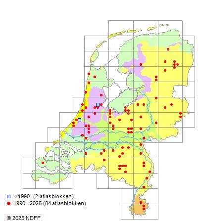 Het aantal atlasblokken (5x5 km) waarin de soort is gemeld binnen een periode van vijf jaar (vanaf 1980) of twintig jaar. Niet gecorrigeerd voor waarnemersinspanning en het aantal doorgegeven waarnemingen kan sterk variëren per periode, dus een trend in verspreiding kan hier niet direct uit worden afgelezen. Het opgegeven jaartal is het eerste jaar van de periode. Bron: gevalideerde waarnemingen uit de NDFF.