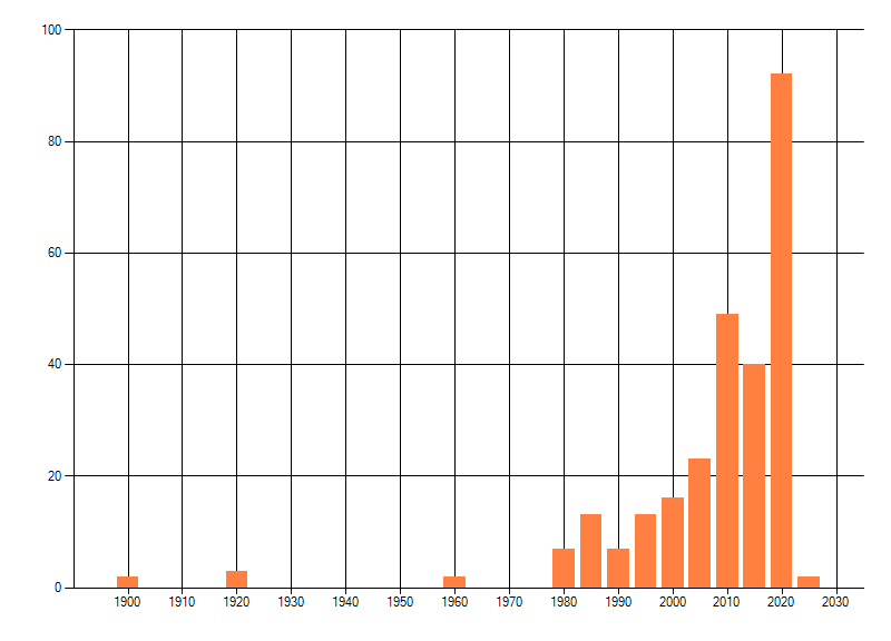 Het aantal atlasblokken (5x5 km) waarin de soort is gemeld binnen een periode van vijf jaar (vanaf 1980) of twintig jaar. Niet gecorrigeerd voor waarnemersinspanning en het aantal doorgegeven waarnemingen kan sterk variëren per periode, dus een trend in verspreiding kan hier niet direct uit worden afgelezen. Het opgegeven jaartal is het eerste jaar van de periode. Bron: gevalideerde waarnemingen uit de NDFF.