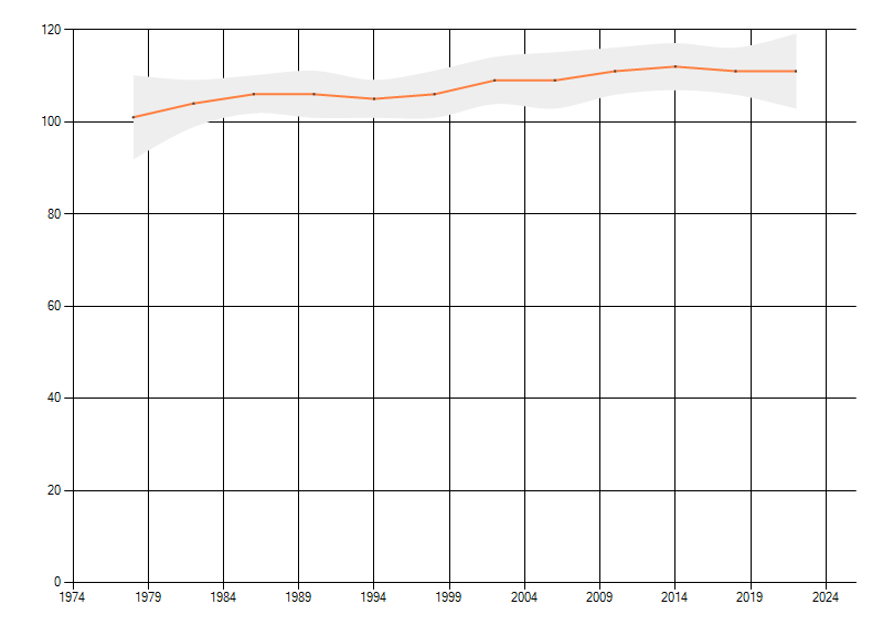 Gemiddelde trend van het aantal kilometerhokken waarin de soort voorkomt, weergegeven als indexcijfer (1975-1978 = 100).