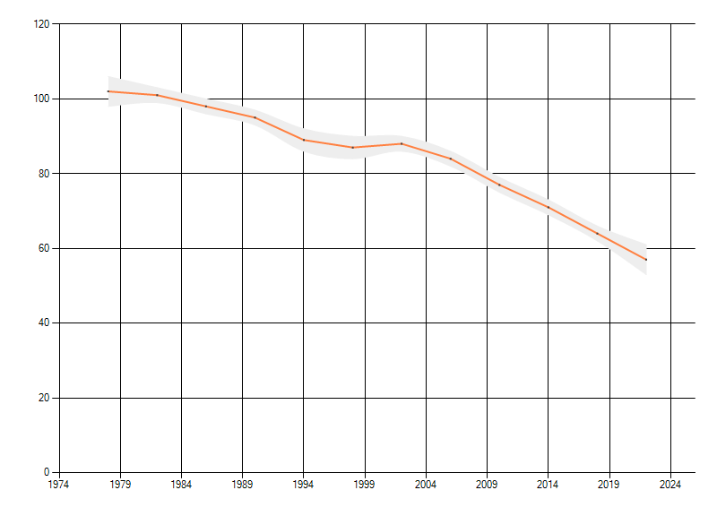 Gemiddelde trend van het aantal kilometerhokken waarin de soort voorkomt, weergegeven als indexcijfer (1975-1978 = 100).