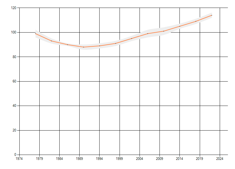 Gemiddelde trend van het aantal kilometerhokken waarin de soort voorkomt, weergegeven als indexcijfer (1975-1978 = 100).