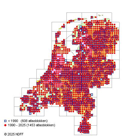 Het aantal atlasblokken (5x5 km) waarin de soort is gemeld binnen een periode van vijf jaar (vanaf 1980) of twintig jaar. Niet gecorrigeerd voor waarnemersinspanning en het aantal doorgegeven waarnemingen kan sterk variëren per periode, dus een trend in verspreiding kan hier niet direct uit worden afgelezen. Het opgegeven jaartal is het eerste jaar van de periode. Bron: gevalideerde waarnemingen uit de NDFF.