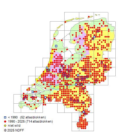 Het aantal atlasblokken (5x5 km) waarin de soort is gemeld binnen een periode van vijf jaar (vanaf 1980) of twintig jaar. Niet gecorrigeerd voor waarnemersinspanning en het aantal doorgegeven waarnemingen kan sterk variëren per periode, dus een trend in verspreiding kan hier niet direct uit worden afgelezen. Het opgegeven jaartal is het eerste jaar van de periode. Bron: gevalideerde waarnemingen uit de NDFF.