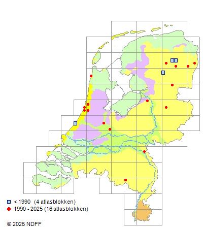 Het aantal atlasblokken (5x5 km) waarin de soort is gemeld binnen een periode van vijf jaar (vanaf 1980) of twintig jaar. Niet gecorrigeerd voor waarnemersinspanning en het aantal doorgegeven waarnemingen kan sterk variëren per periode, dus een trend in verspreiding kan hier niet direct uit worden afgelezen. Het opgegeven jaartal is het eerste jaar van de periode. Bron: gevalideerde waarnemingen uit de NDFF.