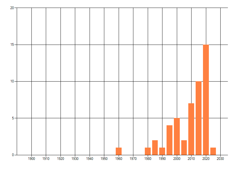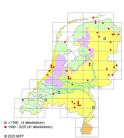 Het aantal atlasblokken (5x5 km) waarin de soort is gemeld binnen een periode van vijf jaar (vanaf 1980) of twintig jaar. Niet gecorrigeerd voor waarnemersinspanning en het aantal doorgegeven waarnemingen kan sterk variëren per periode, dus een trend in verspreiding kan hier niet direct uit worden afgelezen. Het opgegeven jaartal is het eerste jaar van de periode. Bron: gevalideerde waarnemingen uit de NDFF.