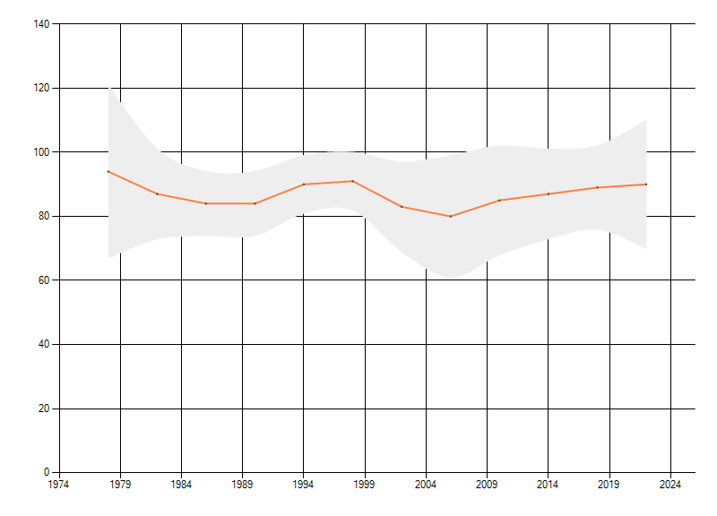 Gemiddelde trend van het aantal kilometerhokken waarin de soort voorkomt, weergegeven als indexcijfer (1975-1978 = 100). De trend is gecorrigeerd voor waarnemersinspanning en geeft de relatieve verandering in het aantal bezette kilometerhokken weer. Voor de berekening worden de data per periode van vier jaar samengenomen. In de grafiek correspondeert ieder punt met het laatste jaar van zo'n periode.