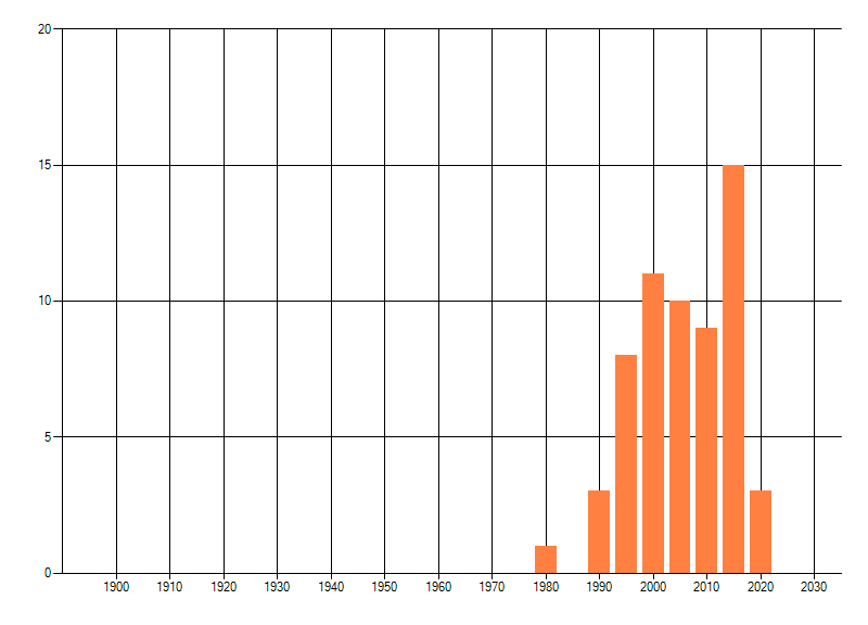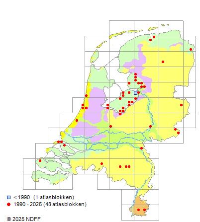 Het aantal atlasblokken (5x5 km) waarin de soort is gemeld binnen een periode van vijf jaar (vanaf 1980) of twintig jaar. Niet gecorrigeerd voor waarnemersinspanning en het aantal doorgegeven waarnemingen kan sterk variëren per periode, dus een trend in verspreiding kan hier niet direct uit worden afgelezen. Het opgegeven jaartal is het eerste jaar van de periode. Bron: gevalideerde waarnemingen uit de NDFF.