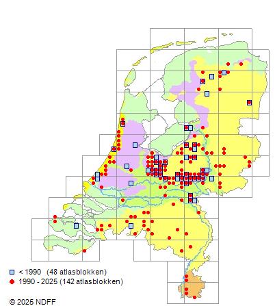 Het aantal atlasblokken (5x5 km) waarin de soort is gemeld binnen een periode van vijf jaar (vanaf 1980) of twintig jaar. Niet gecorrigeerd voor waarnemersinspanning en het aantal doorgegeven waarnemingen kan sterk variƫren per periode, dus een trend in verspreiding kan hier niet direct uit worden afgelezen. Het opgegeven jaartal is het eerste jaar van de periode. Bron: gevalideerde waarnemingen uit de NDFF.