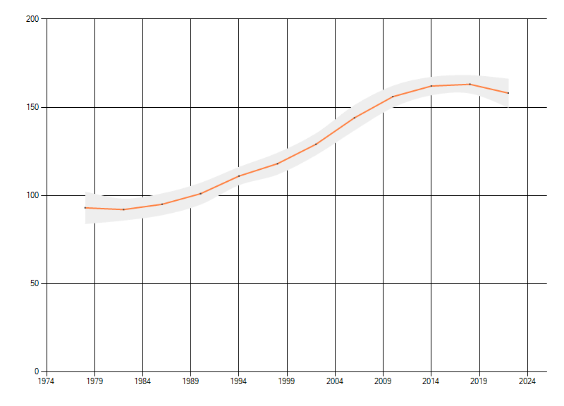 Gemiddelde trend van het aantal kilometerhokken waarin de soort voorkomt, weergegeven als indexcijfer (1975-1978 = 100).