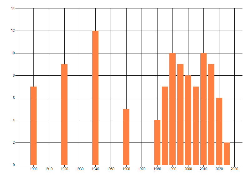 Het aantal atlasblokken (5x5 km) waarin de soort is gemeld binnen een periode van vijf jaar (vanaf 1980) of twintig jaar. Niet gecorrigeerd voor waarnemersinspanning en het aantal doorgegeven waarnemingen kan sterk variëren per periode, dus een trend in verspreiding kan hier niet direct uit worden afgelezen. Het opgegeven jaartal is het eerste jaar van de periode. Bron: gevalideerde waarnemingen uit de NDFF.