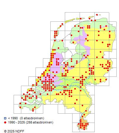 Het aantal atlasblokken (5x5 km) waarin de soort is gemeld binnen een periode van vijf jaar (vanaf 1980) of twintig jaar. Niet gecorrigeerd voor waarnemersinspanning en het aantal doorgegeven waarnemingen kan sterk variëren per periode, dus een trend in verspreiding kan hier niet direct uit worden afgelezen. Het opgegeven jaartal is het eerste jaar van de periode. Bron: gevalideerde waarnemingen uit de NDFF.