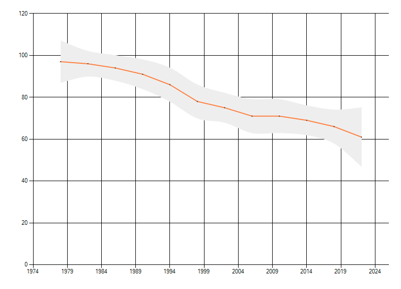 Gemiddelde trend van het aantal kilometerhokken waarin de soort voorkomt, weergegeven als indexcijfer (1975-1978 = 100).
