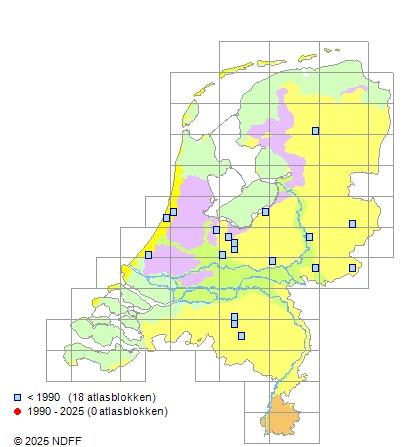 Twijfelachtig inheems. Twee recente meldingen (Delden, 1972; Zeist, Wulperhorst, 1967), doch identiteit onzeker. Volgens Maas G. (loc. cit., 1975) in Nederland "met zekerheid ontbrekend".