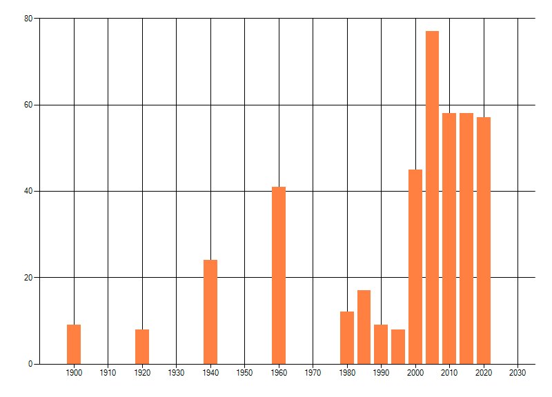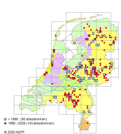 Het aantal atlasblokken (5x5 km) waarin de soort is gemeld binnen een periode van vijf jaar (vanaf 1980) of twintig jaar. Niet gecorrigeerd voor waarnemersinspanning en het aantal doorgegeven waarnemingen kan sterk variëren per periode, dus een trend in verspreiding kan hier niet direct uit worden afgelezen. Het opgegeven jaartal is het eerste jaar van de periode. Bron: gevalideerde waarnemingen uit de NDFF.