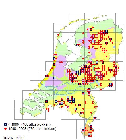 Het aantal atlasblokken (5x5 km) waarin de soort is gemeld binnen een periode van vijf jaar (vanaf 1980) of twintig jaar. Niet gecorrigeerd voor waarnemersinspanning en het aantal doorgegeven waarnemingen kan sterk variëren per periode, dus een trend in verspreiding kan hier niet direct uit worden afgelezen. Het opgegeven jaartal is het eerste jaar van de periode. Bron: gevalideerde waarnemingen uit de NDFF.