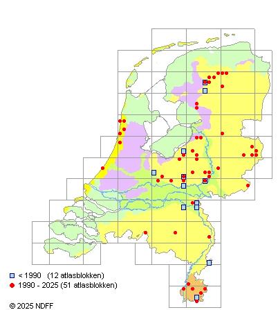 Het aantal atlasblokken (5x5 km) waarin de soort is gemeld binnen een periode van vijf jaar (vanaf 1980) of twintig jaar. Niet gecorrigeerd voor waarnemersinspanning en het aantal doorgegeven waarnemingen kan sterk variëren per periode, dus een trend in verspreiding kan hier niet direct uit worden afgelezen. Het opgegeven jaartal is het eerste jaar van de periode. Bron: gevalideerde waarnemingen uit de NDFF.