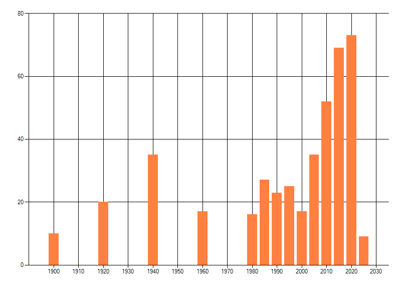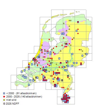 Het aantal atlasblokken (5x5 km) waarin de soort is gemeld binnen een periode van vijf jaar (vanaf 1980) of twintig jaar. Niet gecorrigeerd voor waarnemersinspanning en het aantal doorgegeven waarnemingen kan sterk variëren per periode, dus een trend in verspreiding kan hier niet direct uit worden afgelezen. Het opgegeven jaartal is het eerste jaar van de periode. Bron: gevalideerde waarnemingen uit de NDFF.