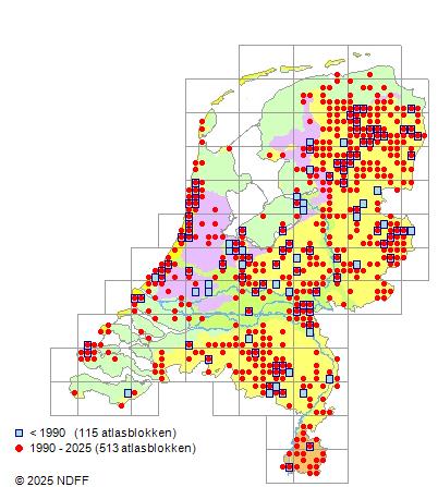 Het aantal atlasblokken (5x5 km) waarin de soort is gemeld binnen een periode van vijf jaar (vanaf 1980) of twintig jaar. Niet gecorrigeerd voor waarnemersinspanning en het aantal doorgegeven waarnemingen kan sterk variëren per periode, dus een trend in verspreiding kan hier niet direct uit worden afgelezen. Het opgegeven jaartal is het eerste jaar van de periode. Bron: gevalideerde waarnemingen uit de NDFF.