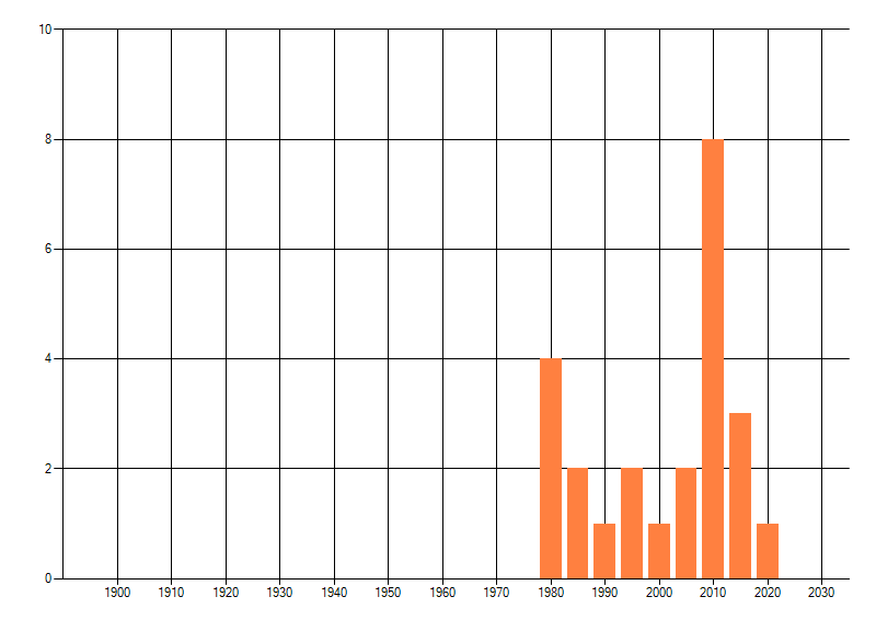 Het aantal atlasblokken (5x5 km) waarin de soort is gemeld binnen een periode van vijf jaar (vanaf 1980) of twintig jaar. Niet gecorrigeerd voor waarnemersinspanning en het aantal doorgegeven waarnemingen kan sterk variëren per periode, dus een trend in verspreiding kan hier niet direct uit worden afgelezen. Het opgegeven jaartal is het eerste jaar van de periode. Bron: gevalideerde waarnemingen uit de NDFF.