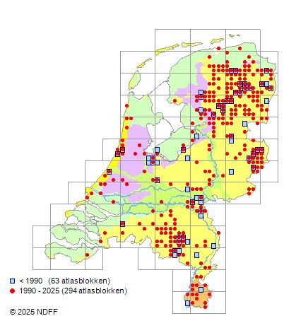 Het aantal atlasblokken (5x5 km) waarin de soort is gemeld binnen een periode van vijf jaar (vanaf 1980) of twintig jaar. Niet gecorrigeerd voor waarnemersinspanning en het aantal doorgegeven waarnemingen kan sterk variëren per periode, dus een trend in verspreiding kan hier niet direct uit worden afgelezen. Het opgegeven jaartal is het eerste jaar van de periode. Bron: gevalideerde waarnemingen uit de NDFF.