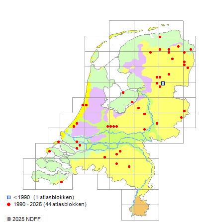 Het aantal atlasblokken (5x5 km) waarin de soort is gemeld binnen een periode van vijf jaar (vanaf 1980) of twintig jaar. Niet gecorrigeerd voor waarnemersinspanning en het aantal doorgegeven waarnemingen kan sterk variëren per periode, dus een trend in verspreiding kan hier niet direct uit worden afgelezen. Het opgegeven jaartal is het eerste jaar van de periode. Bron: gevalideerde waarnemingen uit de NDFF.