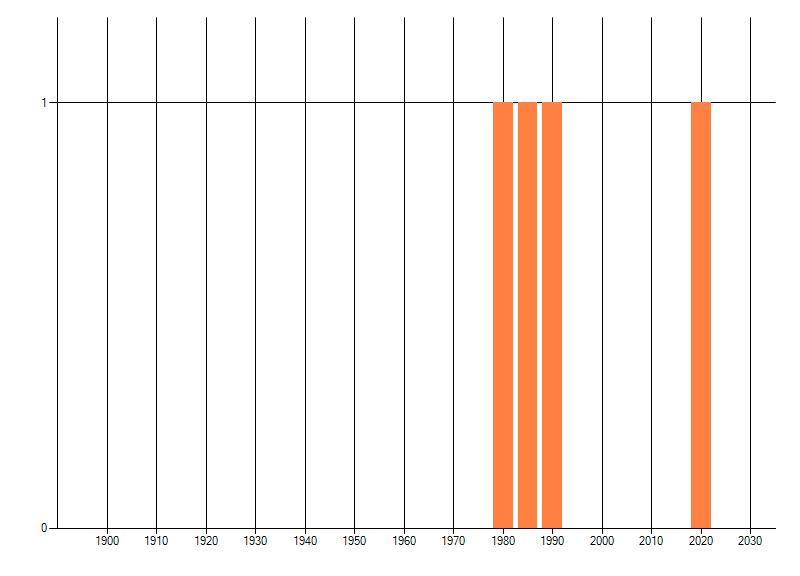 Het aantal atlasblokken (5x5 km) waarin de soort is gemeld binnen een periode van vijf jaar (vanaf 1980) of twintig jaar. Niet gecorrigeerd voor waarnemersinspanning en het aantal doorgegeven waarnemingen kan sterk variëren per periode, dus een trend in verspreiding kan hier niet direct uit worden afgelezen. Het opgegeven jaartal is het eerste jaar van de periode. Bron: gevalideerde waarnemingen uit de NDFF.