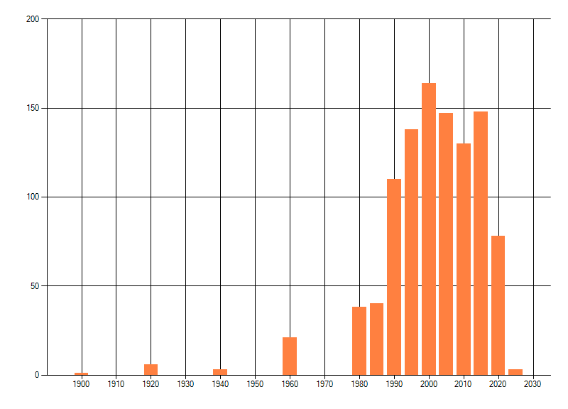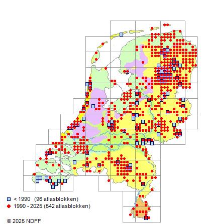 Het aantal atlasblokken (5x5 km) waarin de soort is gemeld binnen een periode van vijf jaar (vanaf 1980) of twintig jaar. Niet gecorrigeerd voor waarnemersinspanning en het aantal doorgegeven waarnemingen kan sterk variëren per periode, dus een trend in verspreiding kan hier niet direct uit worden afgelezen. Het opgegeven jaartal is het eerste jaar van de periode. Bron: gevalideerde waarnemingen uit de NDFF.