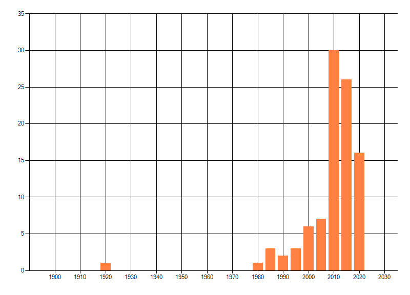 Het aantal atlasblokken (5x5 km) waarin de soort is gemeld binnen een periode van vijf jaar (vanaf 1980) of twintig jaar. Niet gecorrigeerd voor waarnemersinspanning en het aantal doorgegeven waarnemingen kan sterk variëren per periode, dus een trend in verspreiding kan hier niet direct uit worden afgelezen. Het opgegeven jaartal is het eerste jaar van de periode. Bron: gevalideerde waarnemingen uit de NDFF.