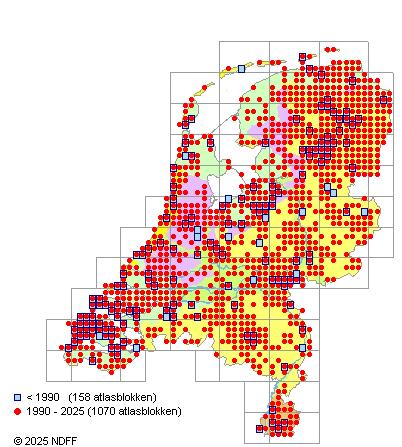 Het aantal atlasblokken (5x5 km) waarin de soort is gemeld binnen een periode van vijf jaar (vanaf 1980) of twintig jaar. Niet gecorrigeerd voor waarnemersinspanning en het aantal doorgegeven waarnemingen kan sterk variëren per periode, dus een trend in verspreiding kan hier niet direct uit worden afgelezen. Het opgegeven jaartal is het eerste jaar van de periode. Bron: gevalideerde waarnemingen uit de NDFF.