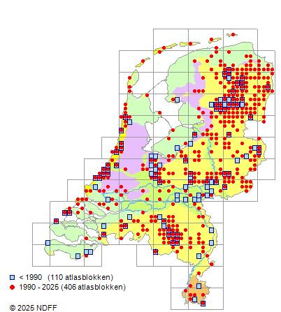 Het aantal atlasblokken (5x5 km) waarin de soort is gemeld binnen een periode van vijf jaar (vanaf 1980) of twintig jaar. Niet gecorrigeerd voor waarnemersinspanning en het aantal doorgegeven waarnemingen kan sterk variëren per periode, dus een trend in verspreiding kan hier niet direct uit worden afgelezen. Het opgegeven jaartal is het eerste jaar van de periode. Bron: gevalideerde waarnemingen uit de NDFF.