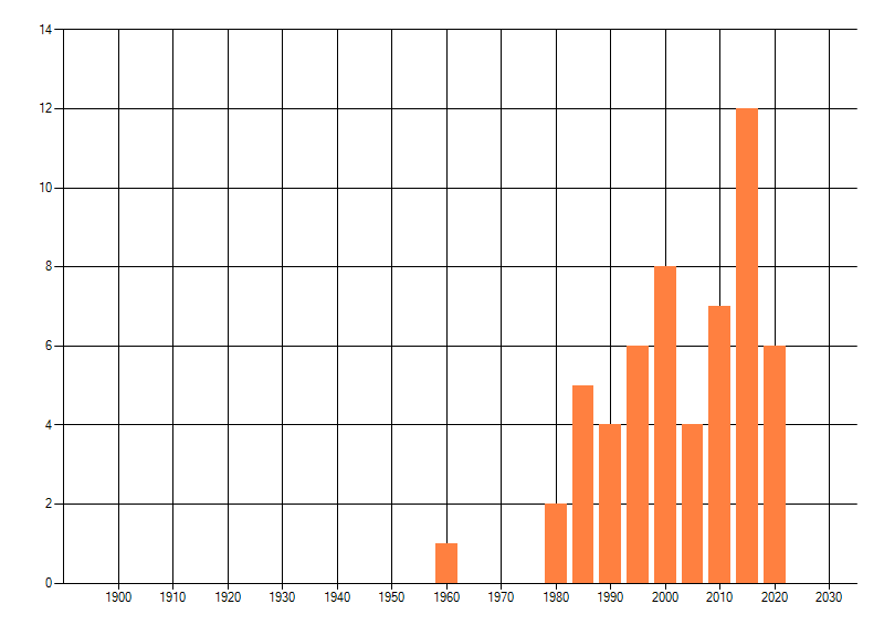 Het aantal atlasblokken (5x5 km) waarin de soort is gemeld binnen een periode van vijf jaar (vanaf 1980) of twintig jaar. Niet gecorrigeerd voor waarnemersinspanning en het aantal doorgegeven waarnemingen kan sterk variëren per periode, dus een trend in verspreiding kan hier niet direct uit worden afgelezen. Het opgegeven jaartal is het eerste jaar van de periode. Bron: gevalideerde waarnemingen uit de NDFF.