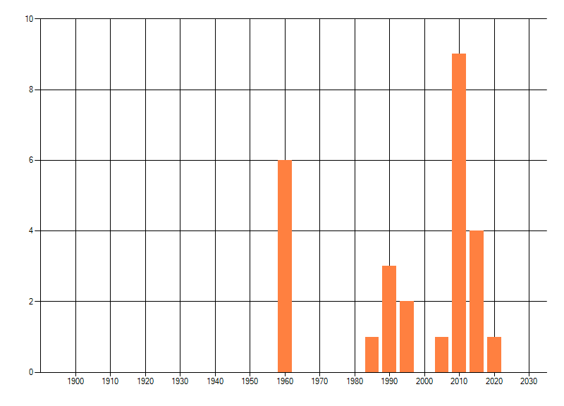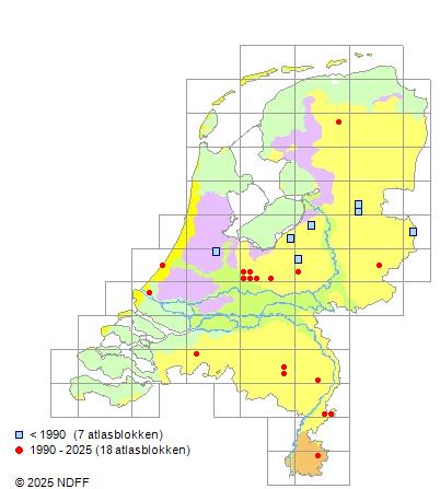 Het aantal atlasblokken (5x5 km) waarin de soort is gemeld binnen een periode van vijf jaar (vanaf 1980) of twintig jaar. Niet gecorrigeerd voor waarnemersinspanning en het aantal doorgegeven waarnemingen kan sterk variëren per periode, dus een trend in verspreiding kan hier niet direct uit worden afgelezen. Het opgegeven jaartal is het eerste jaar van de periode. Bron: gevalideerde waarnemingen uit de NDFF.