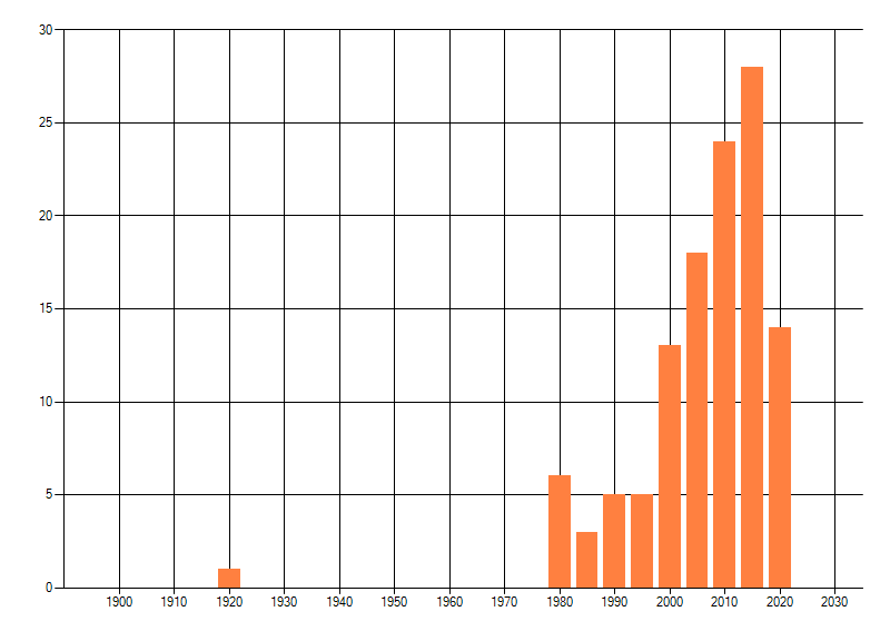 Het aantal atlasblokken (5x5 km) waarin de soort is gemeld binnen een periode van vijf jaar (vanaf 1980) of twintig jaar. Niet gecorrigeerd voor waarnemersinspanning en het aantal doorgegeven waarnemingen kan sterk variëren per periode, dus een trend in verspreiding kan hier niet direct uit worden afgelezen. Het opgegeven jaartal is het eerste jaar van de periode. Bron: gevalideerde waarnemingen uit de NDFF.
