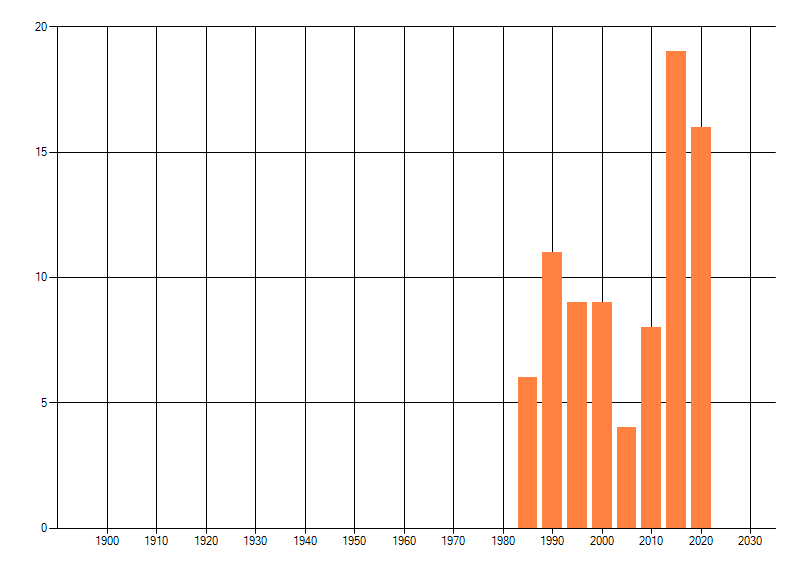 Het aantal atlasblokken (5x5 km) waarin de soort is gemeld binnen een periode van vijf jaar (vanaf 1980) of twintig jaar. Niet gecorrigeerd voor waarnemersinspanning en het aantal doorgegeven waarnemingen kan sterk variëren per periode, dus een trend in verspreiding kan hier niet direct uit worden afgelezen. Het opgegeven jaartal is het eerste jaar van de periode. Bron: gevalideerde waarnemingen uit de NDFF.