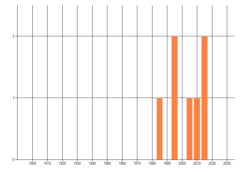 Het aantal atlasblokken (5x5 km) waarin de soort is gemeld binnen een periode van vijf jaar (vanaf 1980) of twintig jaar. Niet gecorrigeerd voor waarnemersinspanning en het aantal doorgegeven waarnemingen kan sterk variëren per periode, dus een trend in verspreiding kan hier niet direct uit worden afgelezen. Het opgegeven jaartal is het eerste jaar van de periode. Bron: gevalideerde waarnemingen uit de NDFF.