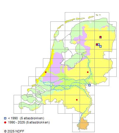 Het aantal atlasblokken (5x5 km) waarin de soort is gemeld binnen een periode van vijf jaar (vanaf 1980) of twintig jaar. Niet gecorrigeerd voor waarnemersinspanning en het aantal doorgegeven waarnemingen kan sterk variëren per periode, dus een trend in verspreiding kan hier niet direct uit worden afgelezen. Het opgegeven jaartal is het eerste jaar van de periode. Bron: gevalideerde waarnemingen uit de NDFF.