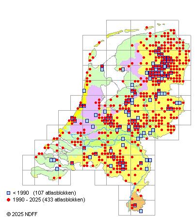 Het aantal atlasblokken (5x5 km) waarin de soort is gemeld binnen een periode van vijf jaar (vanaf 1980) of twintig jaar. Niet gecorrigeerd voor waarnemersinspanning en het aantal doorgegeven waarnemingen kan sterk variëren per periode, dus een trend in verspreiding kan hier niet direct uit worden afgelezen. Het opgegeven jaartal is het eerste jaar van de periode. Bron: gevalideerde waarnemingen uit de NDFF.