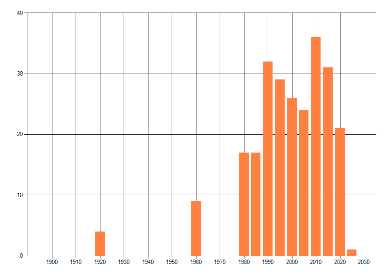 Het aantal atlasblokken (5x5 km) waarin de soort is gemeld binnen een periode van vijf jaar (vanaf 1980) of twintig jaar. Niet gecorrigeerd voor waarnemersinspanning en het aantal doorgegeven waarnemingen kan sterk variëren per periode, dus een trend in verspreiding kan hier niet direct uit worden afgelezen. Het opgegeven jaartal is het eerste jaar van de periode. Bron: gevalideerde waarnemingen uit de NDFF.