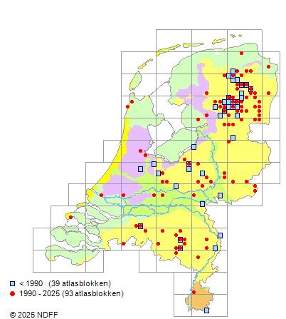 Het aantal atlasblokken (5x5 km) waarin de soort is gemeld binnen een periode van vijf jaar (vanaf 1980) of twintig jaar. Niet gecorrigeerd voor waarnemersinspanning en het aantal doorgegeven waarnemingen kan sterk variëren per periode, dus een trend in verspreiding kan hier niet direct uit worden afgelezen. Het opgegeven jaartal is het eerste jaar van de periode. Bron: gevalideerde waarnemingen uit de NDFF.