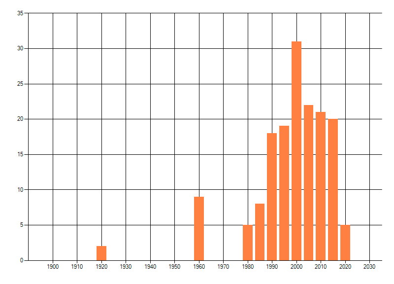 Het aantal atlasblokken (5x5 km) waarin de soort is gemeld binnen een periode van vijf jaar (vanaf 1980) of twintig jaar. Niet gecorrigeerd voor waarnemersinspanning en het aantal doorgegeven waarnemingen kan sterk variëren per periode, dus een trend in verspreiding kan hier niet direct uit worden afgelezen. Het opgegeven jaartal is het eerste jaar van de periode. Bron: gevalideerde waarnemingen uit de NDFF.
