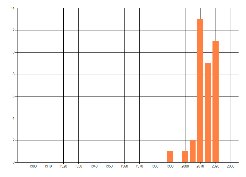 Het aantal atlasblokken (5x5 km) waarin de soort is gemeld binnen een periode van vijf jaar (vanaf 1980) of twintig jaar. Niet gecorrigeerd voor waarnemersinspanning en het aantal doorgegeven waarnemingen kan sterk variëren per periode, dus een trend in verspreiding kan hier niet direct uit worden afgelezen. Het opgegeven jaartal is het eerste jaar van de periode. Bron: gevalideerde waarnemingen uit de NDFF.
