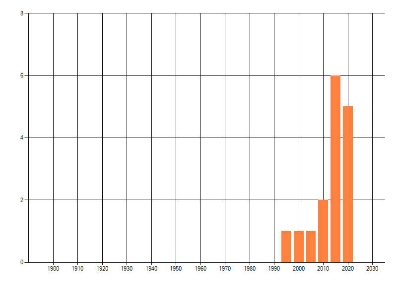 Het aantal atlasblokken (5x5 km) waarin de soort is gemeld binnen een periode van vijf jaar (vanaf 1980) of twintig jaar. Niet gecorrigeerd voor waarnemersinspanning en het aantal doorgegeven waarnemingen kan sterk variëren per periode, dus een trend in verspreiding kan hier niet direct uit worden afgelezen. Het opgegeven jaartal is het eerste jaar van de periode. Bron: gevalideerde waarnemingen uit de NDFF.