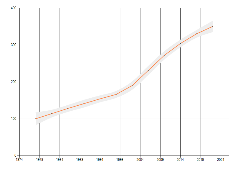 In de grafiek correspondeert ieder punt met het laatste jaar van zo'n periode.