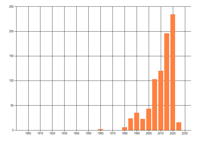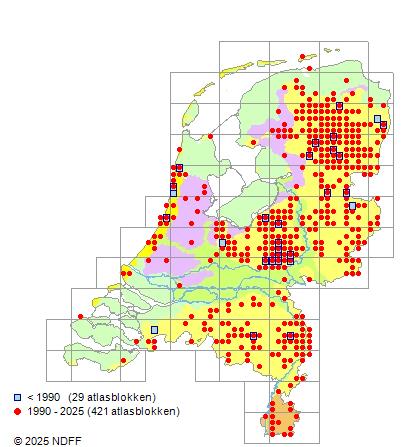 Het aantal atlasblokken (5x5 km) waarin de soort is gemeld binnen een periode van vijf jaar (vanaf 1980) of twintig jaar. Niet gecorrigeerd voor waarnemersinspanning en het aantal doorgegeven waarnemingen kan sterk variëren per periode, dus een trend in verspreiding kan hier niet direct uit worden afgelezen. Het opgegeven jaartal is het eerste jaar van de periode. Bron: gevalideerde waarnemingen uit de NDFF.