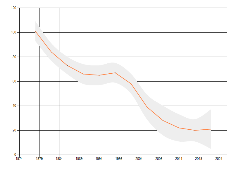 Gemiddelde trend van het aantal kilometerhokken waarin de soort voorkomt, weergegeven als indexcijfer (1975-1978 = 100).