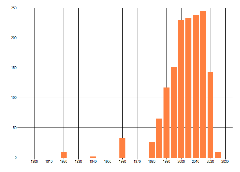 Het aantal atlasblokken (5x5 km) waarin de soort is gemeld binnen een periode van vijf jaar (vanaf 1980) of twintig jaar. Niet gecorrigeerd voor waarnemersinspanning en het aantal doorgegeven waarnemingen kan sterk variëren per periode, dus een trend in verspreiding kan hier niet direct uit worden afgelezen. Het opgegeven jaartal is het eerste jaar van de periode. Bron: gevalideerde waarnemingen uit de NDFF.