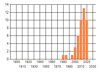 Het aantal atlasblokken (5x5 km) waarin de soort is gemeld binnen een periode van vijf jaar (vanaf 1980) of twintig jaar. Niet gecorrigeerd voor waarnemersinspanning en het aantal doorgegeven waarnemingen kan sterk variëren per periode, dus een trend in verspreiding kan hier niet direct uit worden afgelezen. Het opgegeven jaartal is het eerste jaar van de periode. Bron: gevalideerde waarnemingen uit de NDFF.