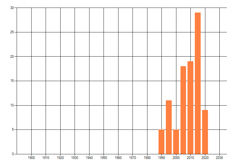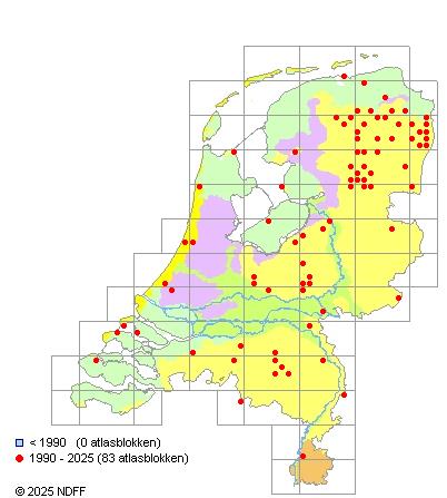 Het aantal atlasblokken (5x5 km) waarin de soort is gemeld binnen een periode van vijf jaar (vanaf 1980) of twintig jaar. Niet gecorrigeerd voor waarnemersinspanning en het aantal doorgegeven waarnemingen kan sterk variëren per periode, dus een trend in verspreiding kan hier niet direct uit worden afgelezen. Het opgegeven jaartal is het eerste jaar van de periode. Bron: gevalideerde waarnemingen uit de NDFF.