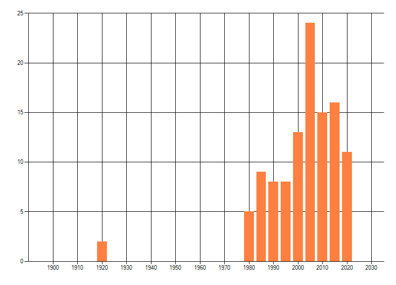 Het aantal atlasblokken (5x5 km) waarin de soort is gemeld binnen een periode van vijf jaar (vanaf 1980) of twintig jaar. Niet gecorrigeerd voor waarnemersinspanning en het aantal doorgegeven waarnemingen kan sterk variëren per periode, dus een trend in verspreiding kan hier niet direct uit worden afgelezen. Het opgegeven jaartal is het eerste jaar van de periode. Bron: gevalideerde waarnemingen uit de NDFF.